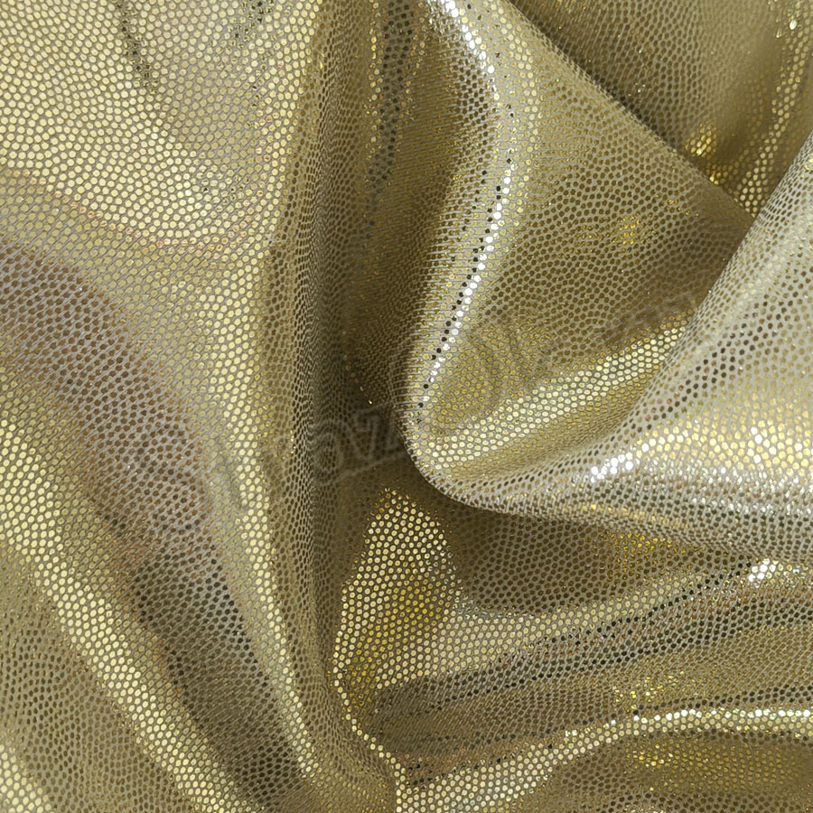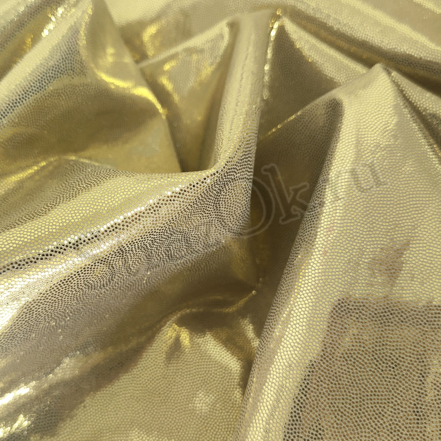 Яркая блестящая трикотажная ткань - голографический Бифлекс специально создана для сценических нарядов и костюмов для выступления. Рисунок голограмма выполнен в виде мелких золотых точек, блесток на телесной основе.