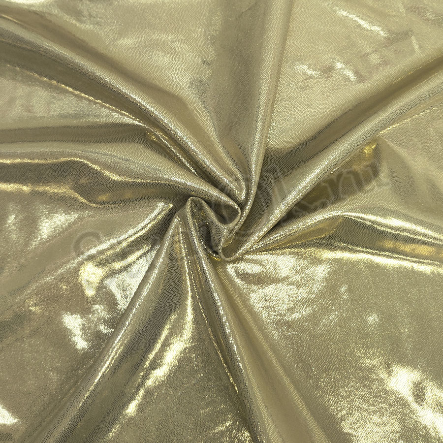Золотистый голографический бифлекс на бежевой плотной основе 200г/м2, ширина 160 см. Ткань имеет хорошее растяжение в обе стороны.