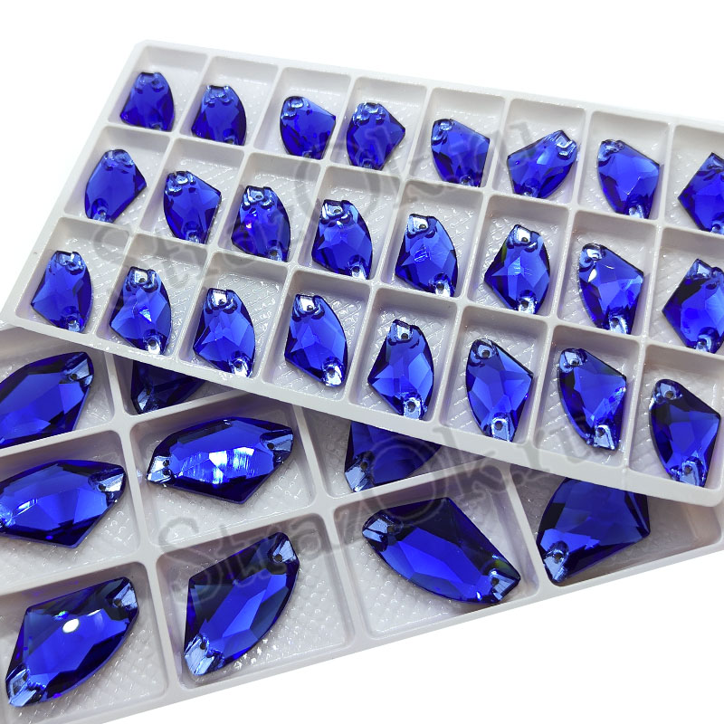 Стразы выполнены из хрустального синего стекла и имеют наивысшую степень отражения и преломления света, за счет чего создают яркий искрящийся блеск. Специальная огранка с дополнительной фаской придают стразам объем и глубину, а дополнительный эффект  наполняет камни самым ярким блеском, делая пришивные стразы наиболее популярными и востребованными в украшении костюмов для выступления.