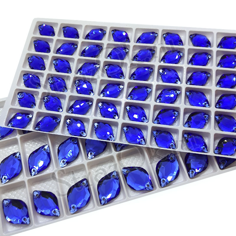 Стразы выполнены из хрустального синего стекла и имеют наивысшую степень отражения и преломления света, за счет чего создают яркий блеск с переливами цвета. Специальная огранка с дополнительной фаской придают стразам объем и глубину.