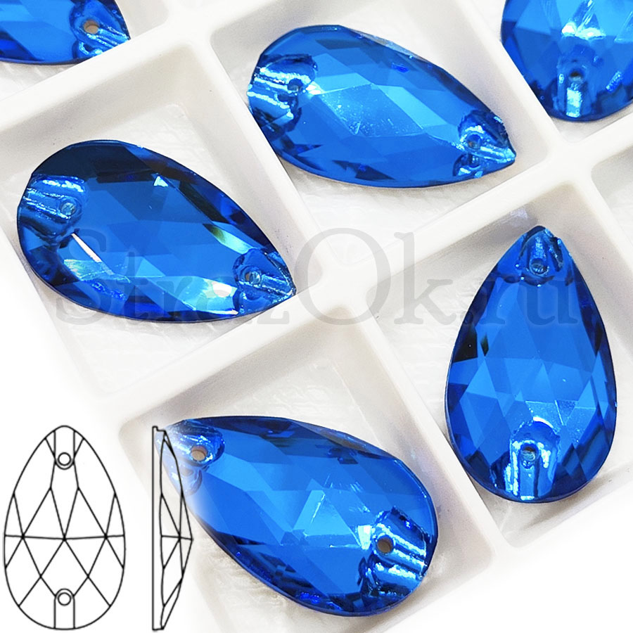 Пришивные (sew-on stone) стеклянные стразы цвета Capri Blue, яркий насыщенный небесно-синий цвет. Стразы изготовлены из хрустального стекла с высокой степенью отражения и преломления света и имеют идеально ровную машинную огранку.  Благодаря яркому цвету и блеску стразы хорошо подходят для украшения и декорирования праздничной и вечерней одежды, платьев для коктейлей, стильных аксессуаров. Спортивной одежды для выступления, такой как купальники для художественной гимнастики и синхронного плавания, акробатики, платьев и костюмов для танцев.
